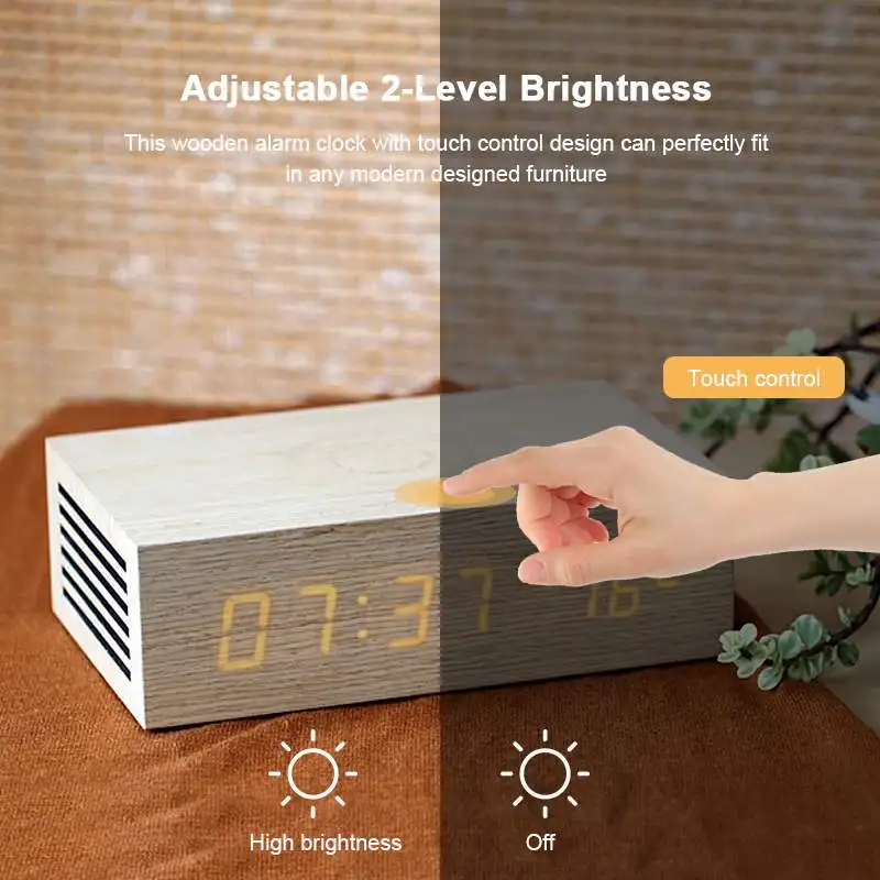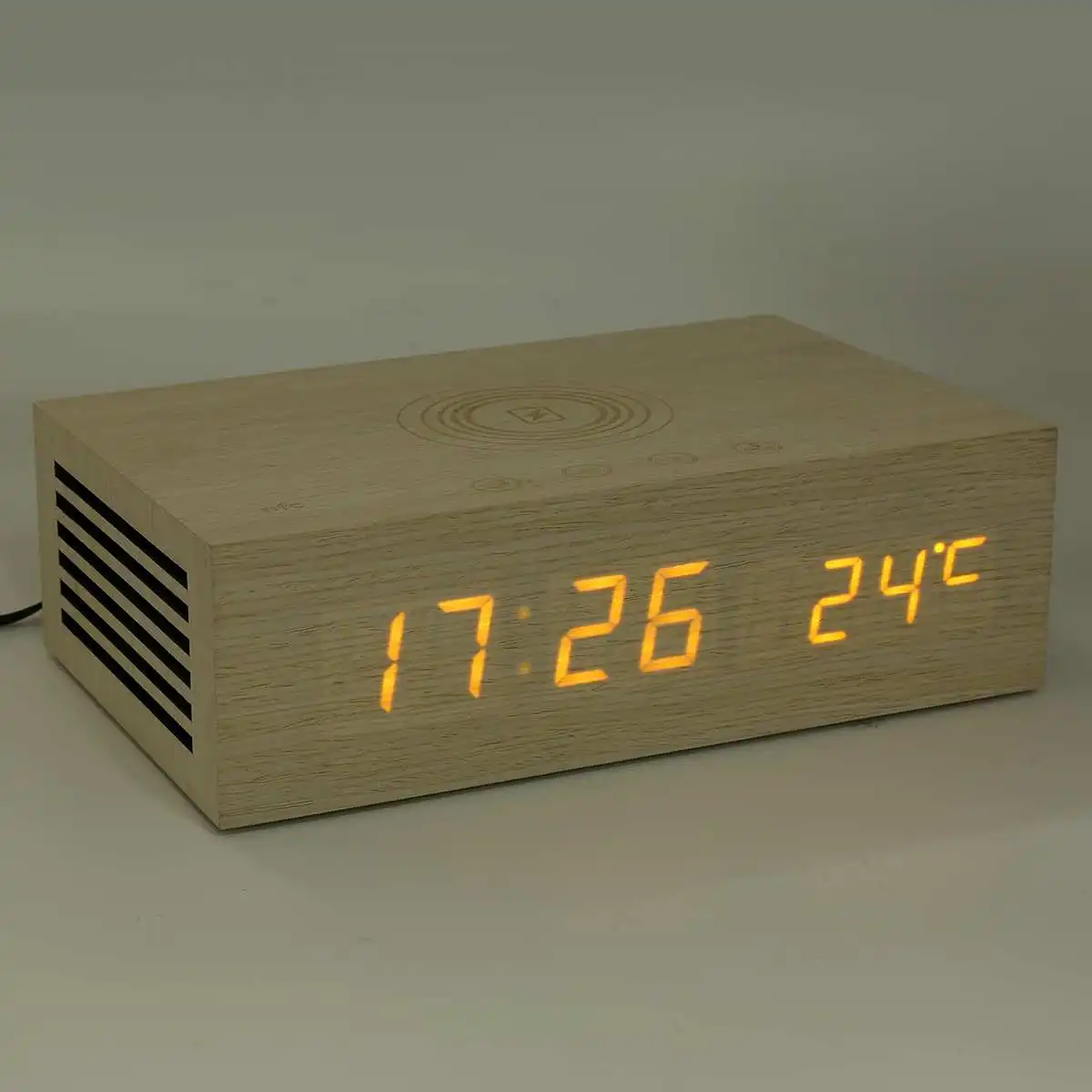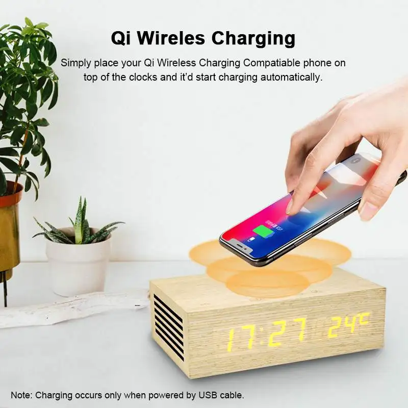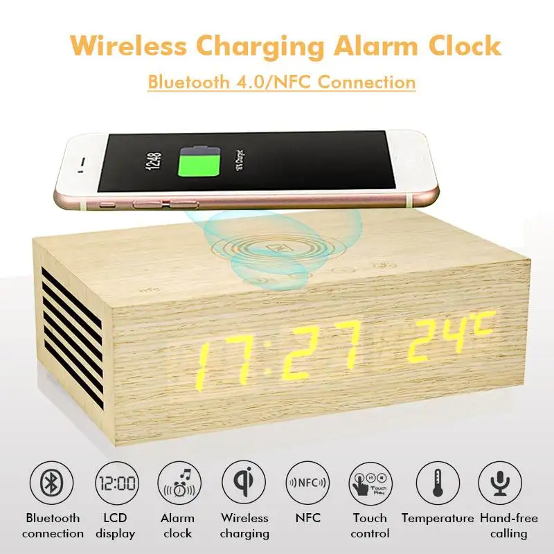 Buy Now Wooden Wood Digital NFC bluetooth Speaker Qi Wireless Charger Snooze Alarm Clock Thermometer Touch